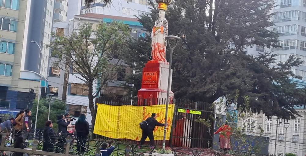 Hace cuatro años, en la misma fecha, el grupo colocó una manta y una pollera en la estatua de Isabel la Católica y también intervino la estatua de Cristóbal Colón, bajo el argumento de que la incursión española promovió una feminidad que desprecia a las mujeres no blancas, considerándolas feas, no deseadas y relegadas a trabajos más baratos y duros.