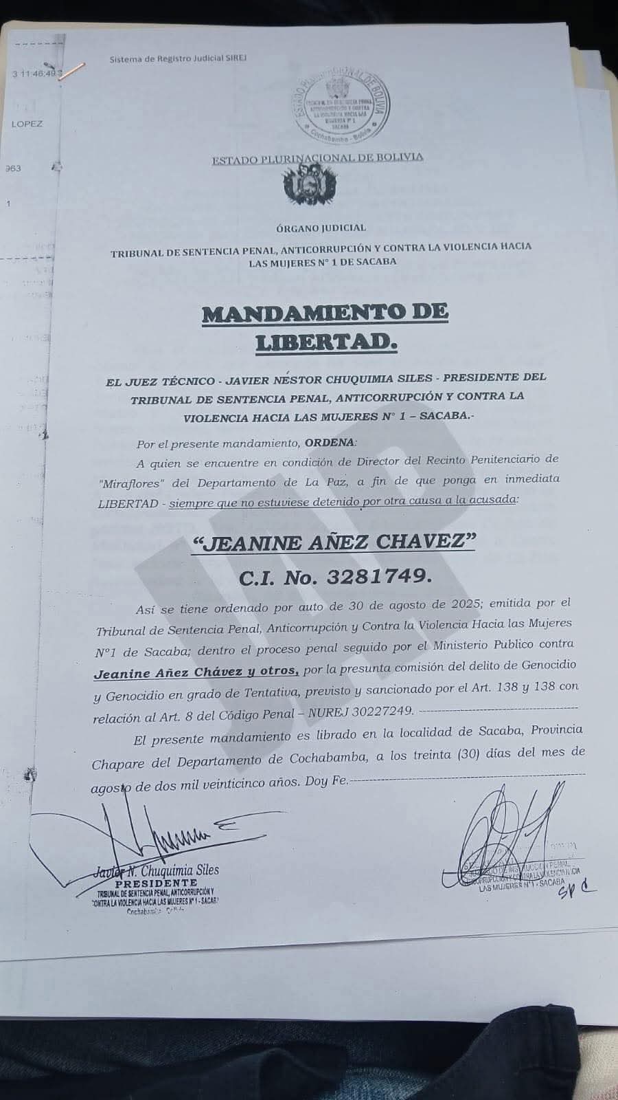 Un juzgado de la ciudad de Sacaba, en Cochabamba, ha emitido un mandamiento de libertad a favor de la expresidenta Jeanine Áñez. La decisión corresponde al caso de las muertes ocurridas en esa localidad en 2019, por el que Áñez será procesada en un juicio de responsabilidades.
